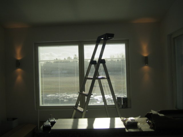 Jääkaappi, pakastin, astianpesukone paikoillaan. Mikroaaltouunin paikka kuvan oikeassa reunassa.