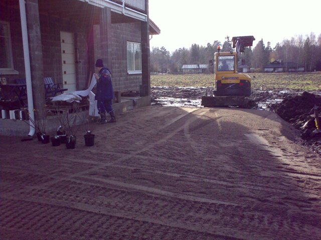Piha oli syksyllä aivan mahdottoman kurainen. Täyttö- ja pintamaan levittäminen oli välillä aivan toivotonta, mutta Mummi ja Pappa urakoivat välillä polvia myöten kurassa ja piha saatiin talvikuntoon.