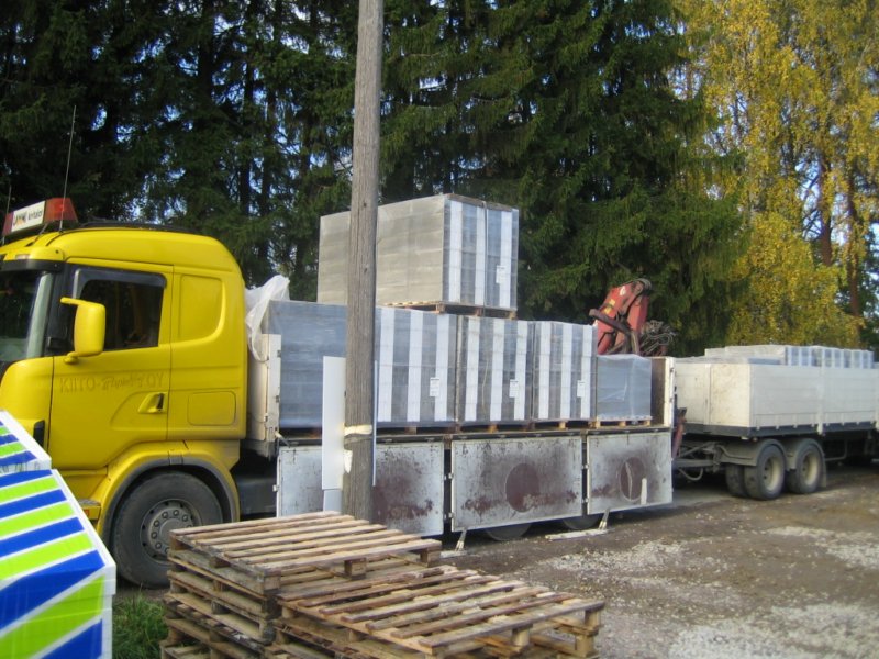 Iso kone - pieni kone. Naapurin tontilla käynnissä pihamaan täyttö ja tasaukset.